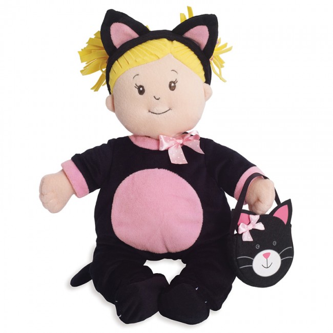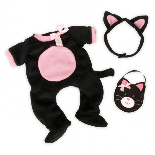 Žameten kostum v črni barvi z belimi in rožnatimi poudarki, bo pričaral nasmeh na vsaka usta. Da pa bi bila oprava popolna, je priložen še naglavni trak z ušeski in prikupna mala torbica v obliki mucke, v katero bo Baby Stella lahko spravila razne dobrote ali drobnarije.