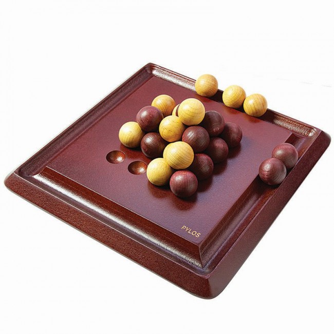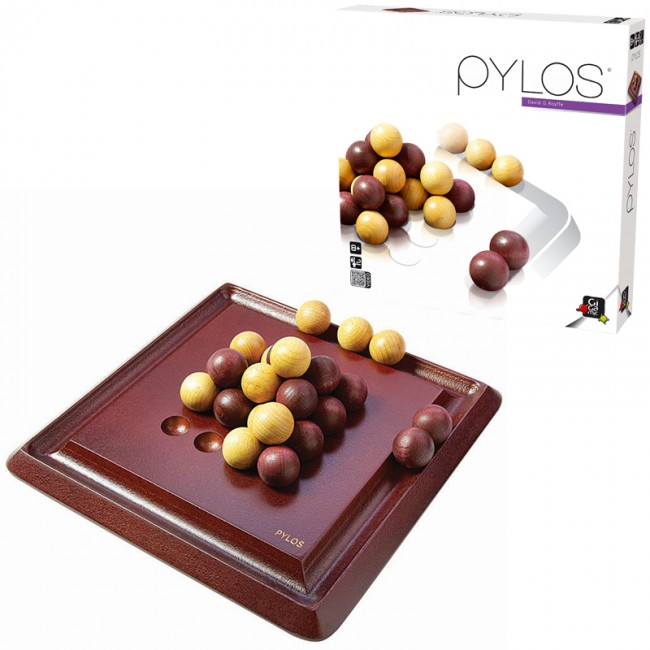 Pylos je miselna igra, ki jo igramo na plošči s 5x5 vdolbinicami za kroglice. Enemu igralcu pripadajo svetle, drugemu temne, in izmenično jih polagata v vdolbinice, da bi ustvarila piramido. A pozor – zmaga tisti, ki mu bo ob zaključku igre ostalo največ kroglic! Kako je to mogoče? Zgolj na en način. Če kroglice zlagate tako dobro, da štiri razporedite v kvadrat, lahko z igralne plošče takoj poberete dve svoji prosti kroglici. Če nasprotni igralec zaključi skupino štirih v kvadrat razporejenih kroglic različne barve, pa lahko njegovo nepazljivost izkoristite za to, da poberete svojo prosto kroglico s plošče in jo postavite na vrh – tako ustvarite naslednji nivo.