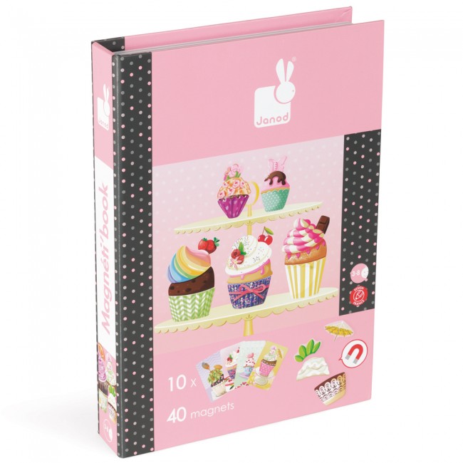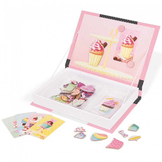 Magnetna knjiga vsebuje 10 kartic ter 40 magnetnih kosov z različnimi deli in prelivi tortic, s katerimi lahko ustvarite nešteto različnih tortic.