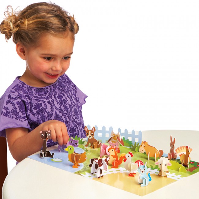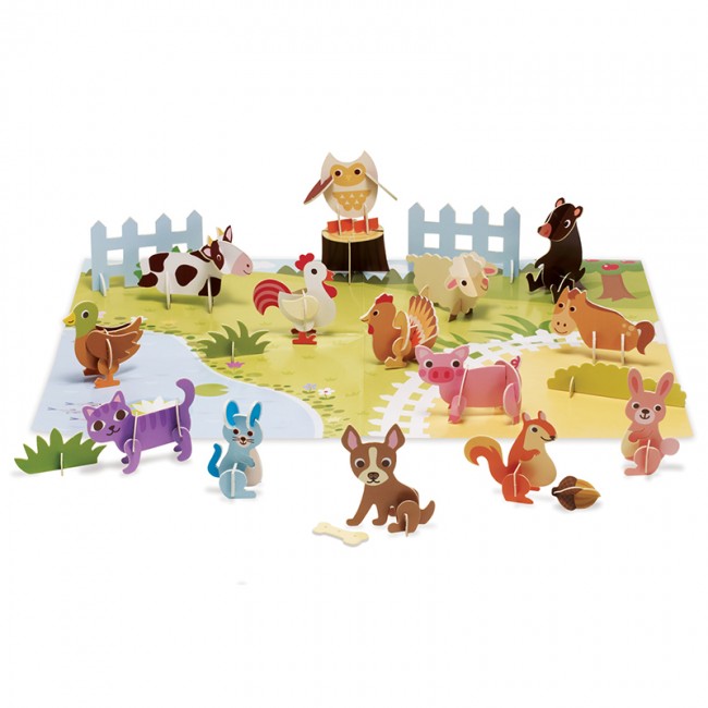Izjemen mini igralni kompet divjih živali vam omogoča sestavljanje 3D živali iz ploskih kosov. Sestavite lahko 18 živali, kot npr. kravico, ovčko, konja, pujsa, petelina in kokoško, mucko, kužka, raco in druge gozdne živali, priloženi pa so tudi razni kosi, ki jih lahko uporabite za kulise.